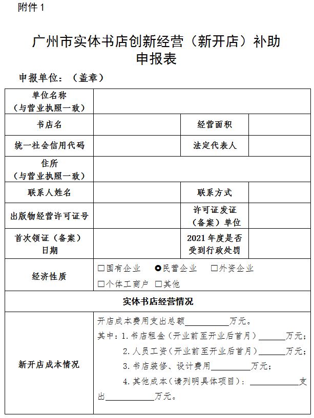 附件:1.广州市实体书店创新经营(新开店)补助申报表