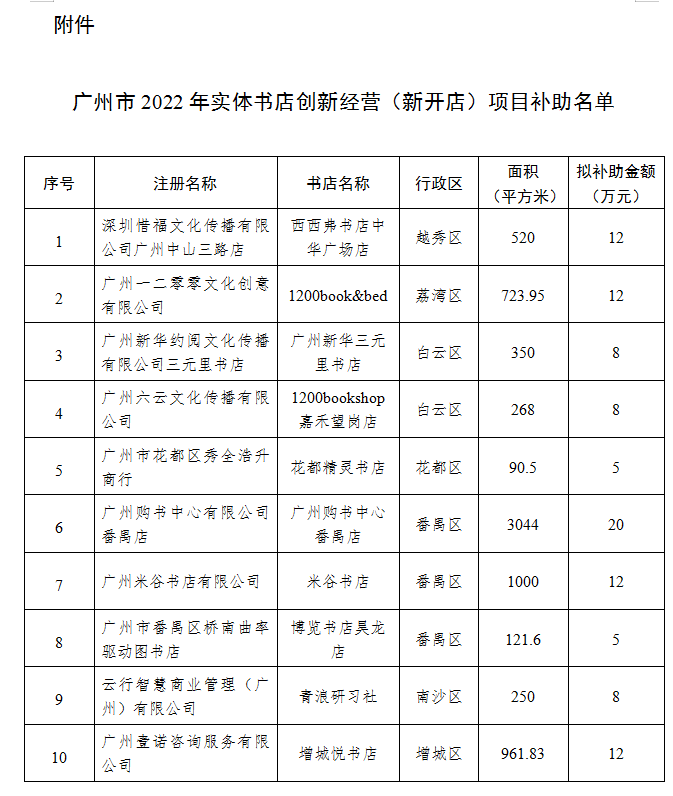 为贯彻落实《出版业“十四五”时期发展规划》关于“加大实体书店支持力度,探索多业态融合发展,全面提升管理、运营、服务水平”的要求,进一步推动我市实体书店持续健康发展,广州市新闻出版局根据《广州市关于支持实体书店发展的实施意见》(穗文广新规〔2018〕9号)精神,组织开展2022年实体书店扶持工作,对2021年1月1日至2021年12月31日期间新开业,且符合《实施意见》规定扶持条件的实体书店,采取创新经营补助的方式予以扶持。经各书店申报、区级新闻出版局初审、市级新闻出版部门终审及现场勘查等程序后,确定深圳惜福文化传播有限公司广州中山三路店等10家实体书店获得广州市2022年实体书店创新经营(新开店)项目补助,现予以公示(具体名单见附件)。