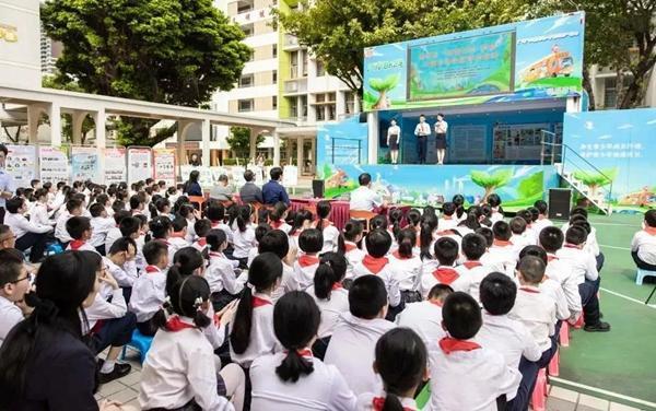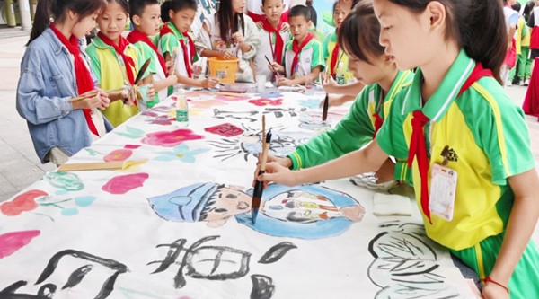 同学们在集科普知识、宣讲表演与视频互动的大篷车进行互动体验学习。活动现场特别设置游园游戏区和创意长卷画区,大家在玩乐、畅画中收获知识。
